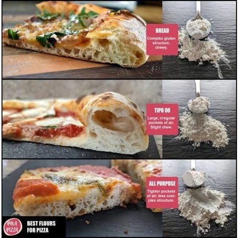 Tại sao lại là bột mì "00"? Việc nghiền mịn bột mì đặc biệt tạo ra một loại bột bánh pizza mềm mịn, có thể kéo dài thành lớp vỏ mỏng với các cạnh phồng, sủi bọt, giống như mì ống với kết cấu mịn, dai. Hơn nữa, hàm lượng gluten vừa phải cho phép bột kéo dài vừa phải mà không bị quá đàn hồi.