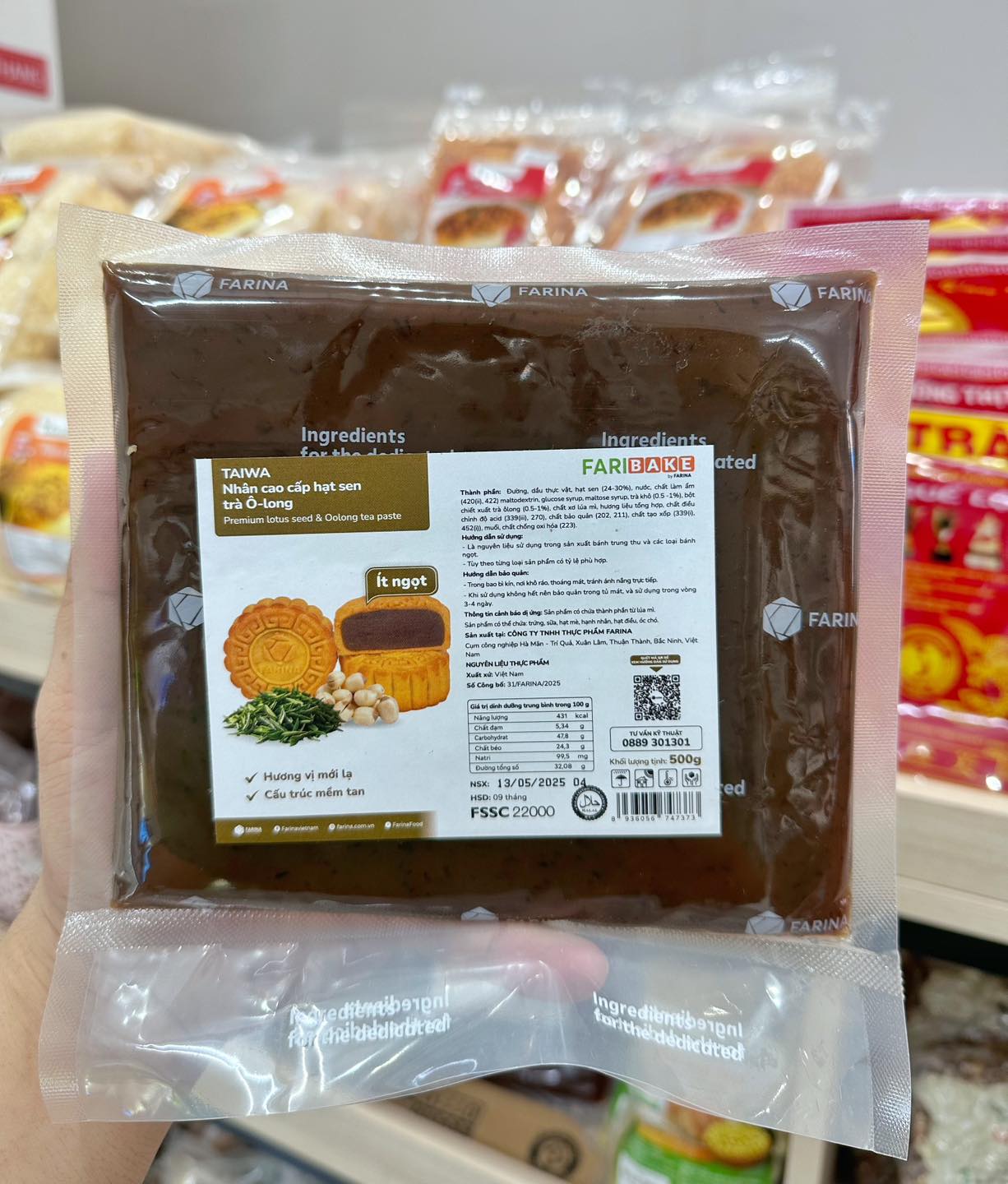 Thành phần : Đường, dầu thực vật, hạt sen (24-30%), nước, chất làm ẩm (420fi), 422) maltodextrin, glucose syrup, maltose syrup, trà khô (0.5 -1%). bột chiết xuất trà ôlong (0.5-1%), chất xơ lúa mì, hương liệu tổng hợp, chất điều chỉnh độ acid (339(ii), 270), chất bảo quản (202, 211), chất tạo xốp (339(i),452(i), muối, chất chống oxi hóa (223).