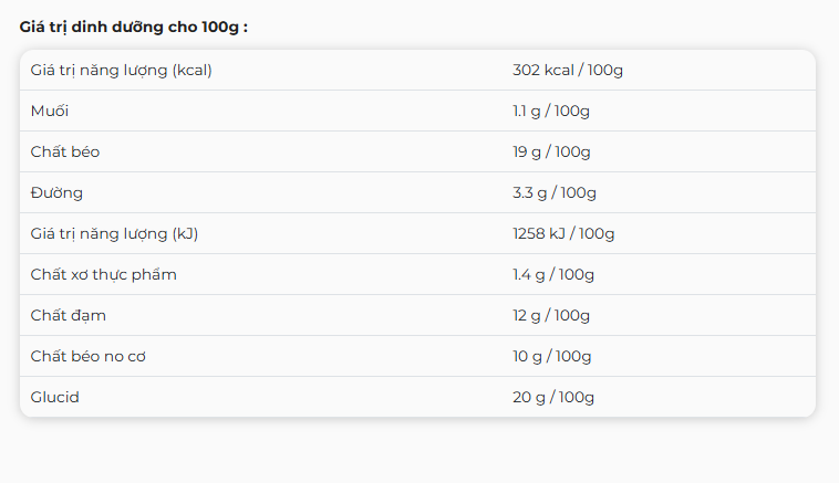 Thành phần: Phô mai Camembert (65%): Camembert với sữa bò tiệt trùng , xuất xứ Pháp (56%), tinh bột khoai tây.