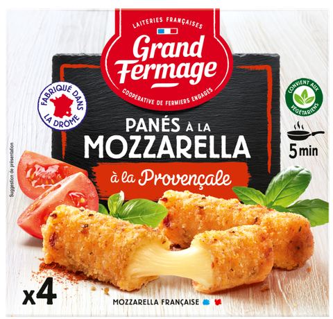 Các sản phẩm Grand Fermage tẩm bột mozzarella kết hợp hương vị giòn tan của lớp vỏ vụn bánh mì Provençal với vị mềm mại và kết cấu của mozzarella.